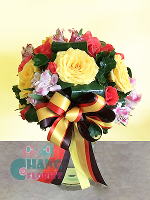 An arrangement of mixture flowers in red, yellow and pink tones.