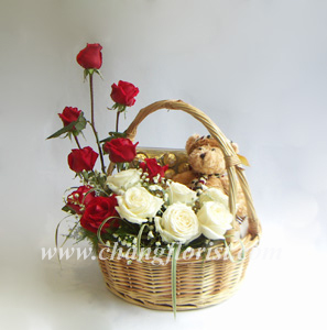 White roses, red roses, little bear and a box of Ferrero Rocher chocolate (24 pieces) set in beautiful baskets. Let this flower basket create a smile for your lover.
