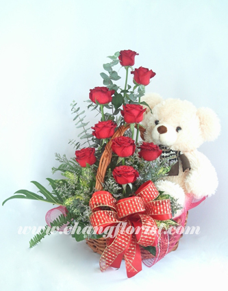 Red roses and white bear arranged in the wicker basket. Bear size is approximately 45-50 cm tall.